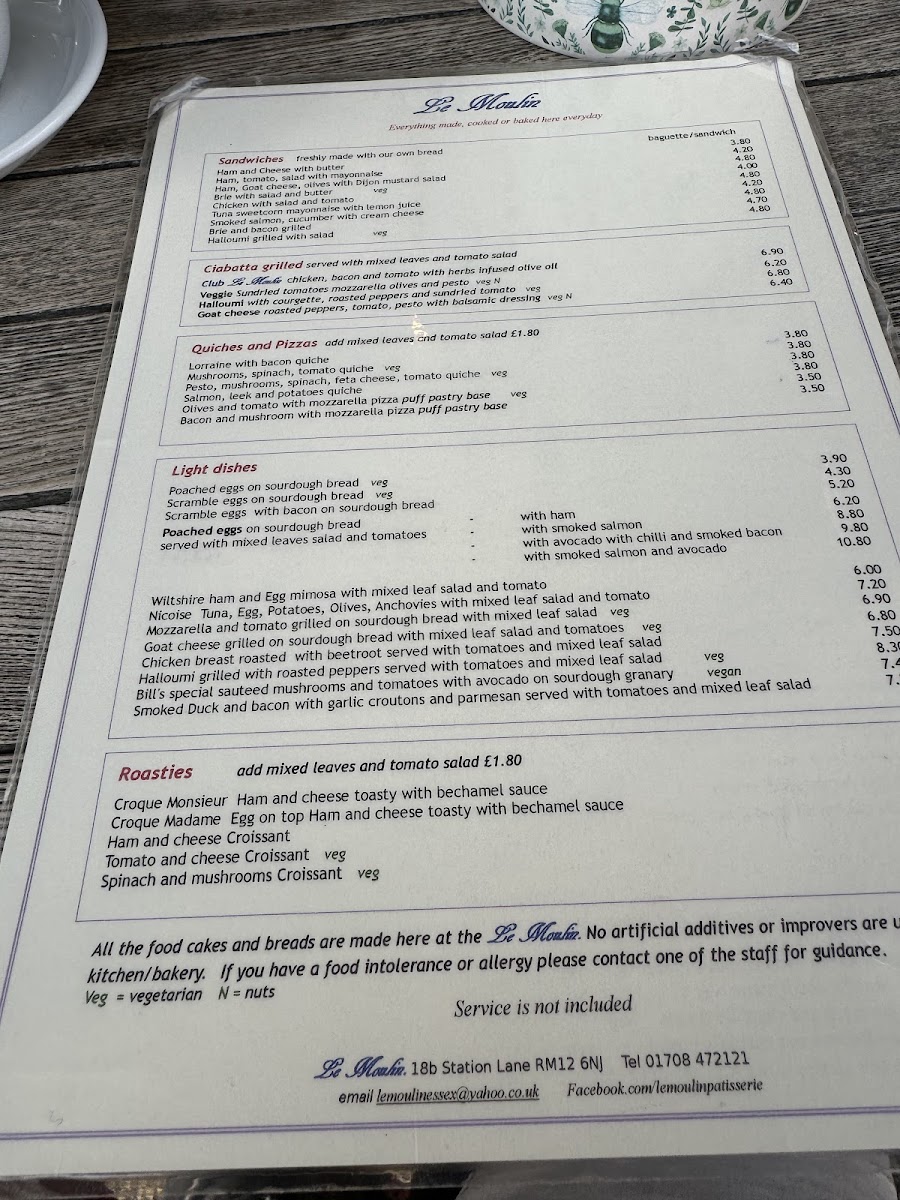 Le Moulin offers a thoughtfully simple menu that reflects the charm of a French café, perfect for enjoying casual breakfasts, light lunches, or afternoon treats. The selection balances comforting homemade dishes with freshly brewed drinks, creating an inviting experience whether you’re starting your day or taking a relaxing break.